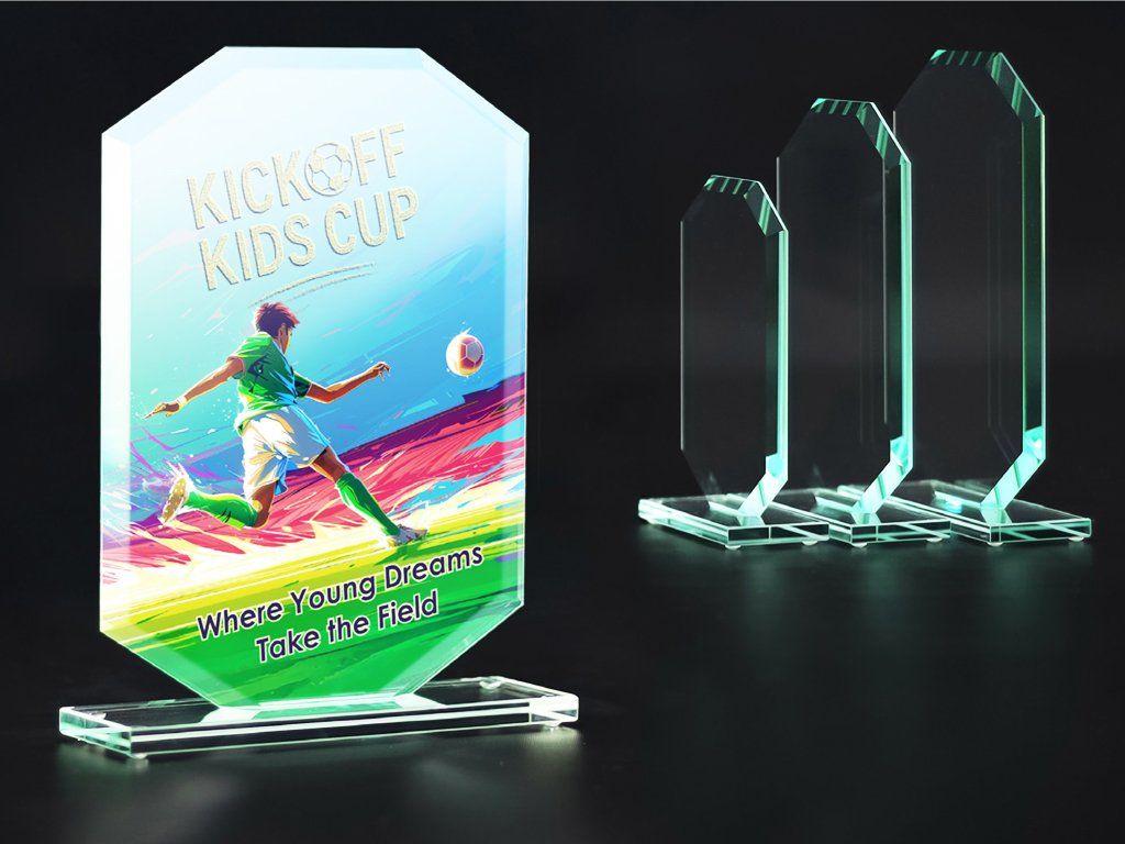 Viditeľnosť farebnej potlače je zvýraznená použitím bieleho podkladu pod farebnými pixelmi. Zvyšok sklenenej trofeje zostáva priehľadný, čo zachováva elegantný a číry vzhľad skla.