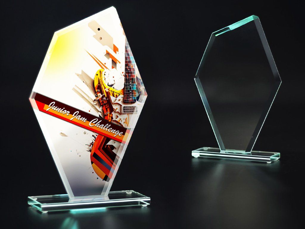 Viditeľnosť farebnej potlače je zvýraznená použitím bieleho podkladu pod farebnými pixelmi. Zvyšok sklenenej trofeje zostáva priehľadný, čo zachováva elegantný a číry vzhľad skla.