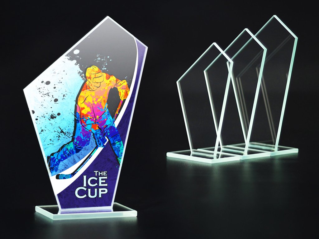 Sklenená trofej určená pre gravírovanie alebo farebnú potlač. Výška trofeje: 20 cm, 18,5 cm a 16,5 cm.