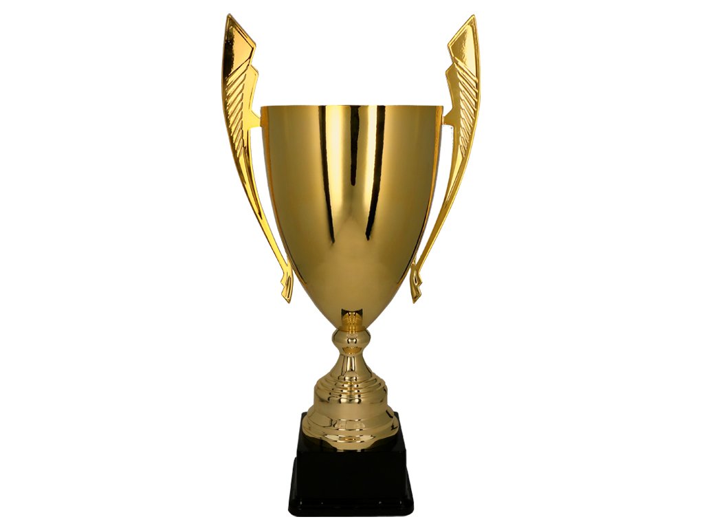 Zlatý kovový pohár na plastovom podstavci na ktorý je možné umiestniť štítok.