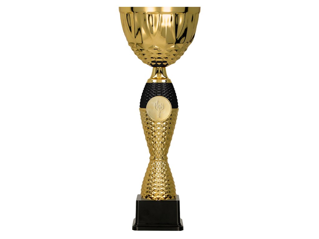 Zlato-čierny kovový pohár na plastovom podstavci na ktorý je možné umiestniť štítok a emblém.
