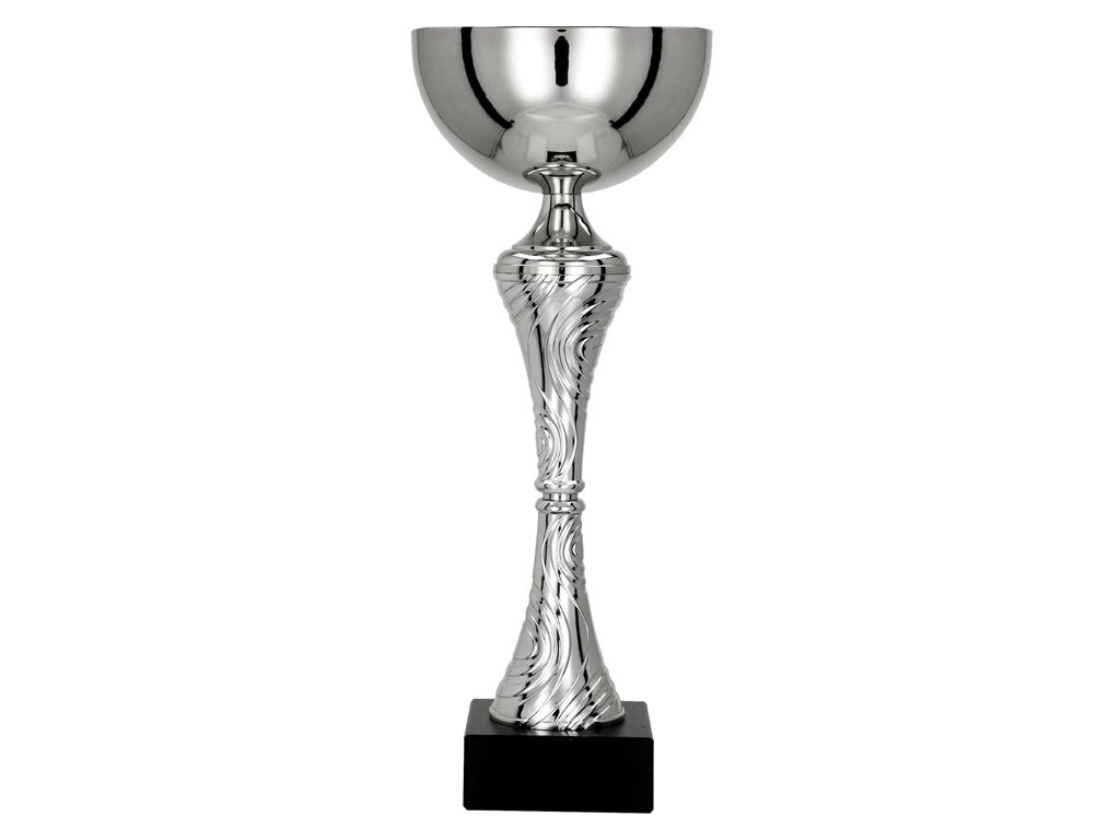 Strieborný kovový pohár na mramorovom podstavci na ktorý je možné umiestniť štítok.