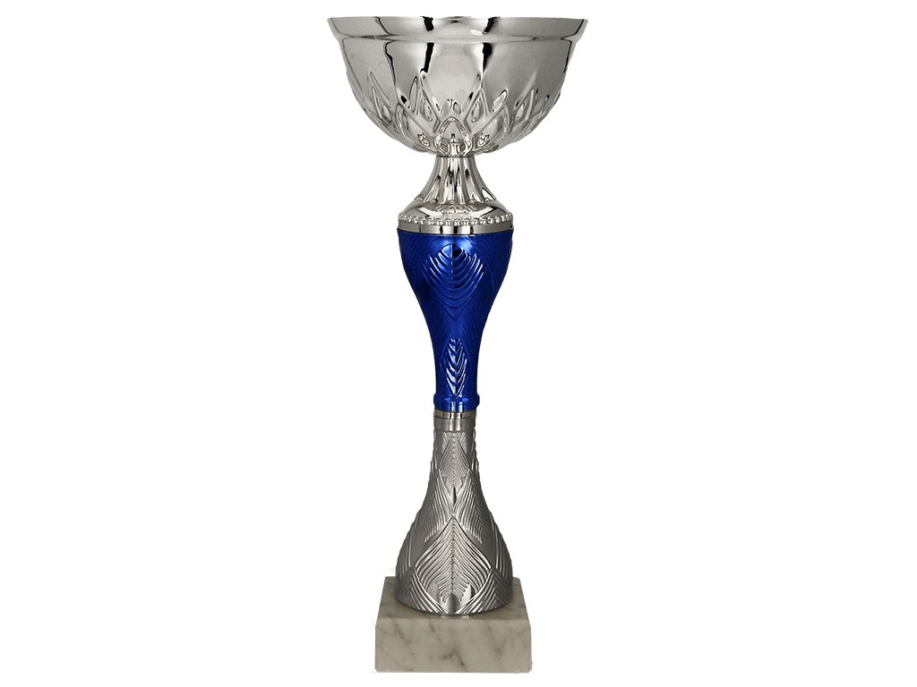 Strieborno-modrý kovový pohár na mramorovom podstavci na ktorý je možné umiestniť štítok.