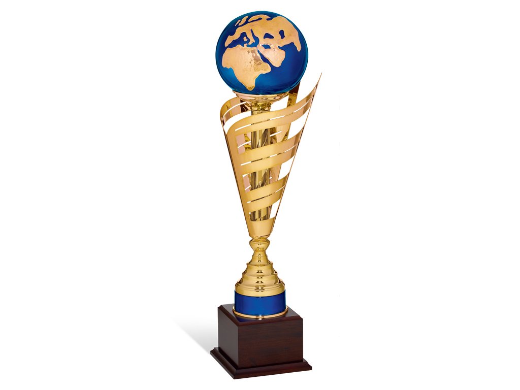 Zlato-strieborný pohár s keramickou zemeguľou na vysokom drevenom podstavci na ktorý je možné umiestniť štítok s textom. Pohár je dostupný v troch veľkostiach.